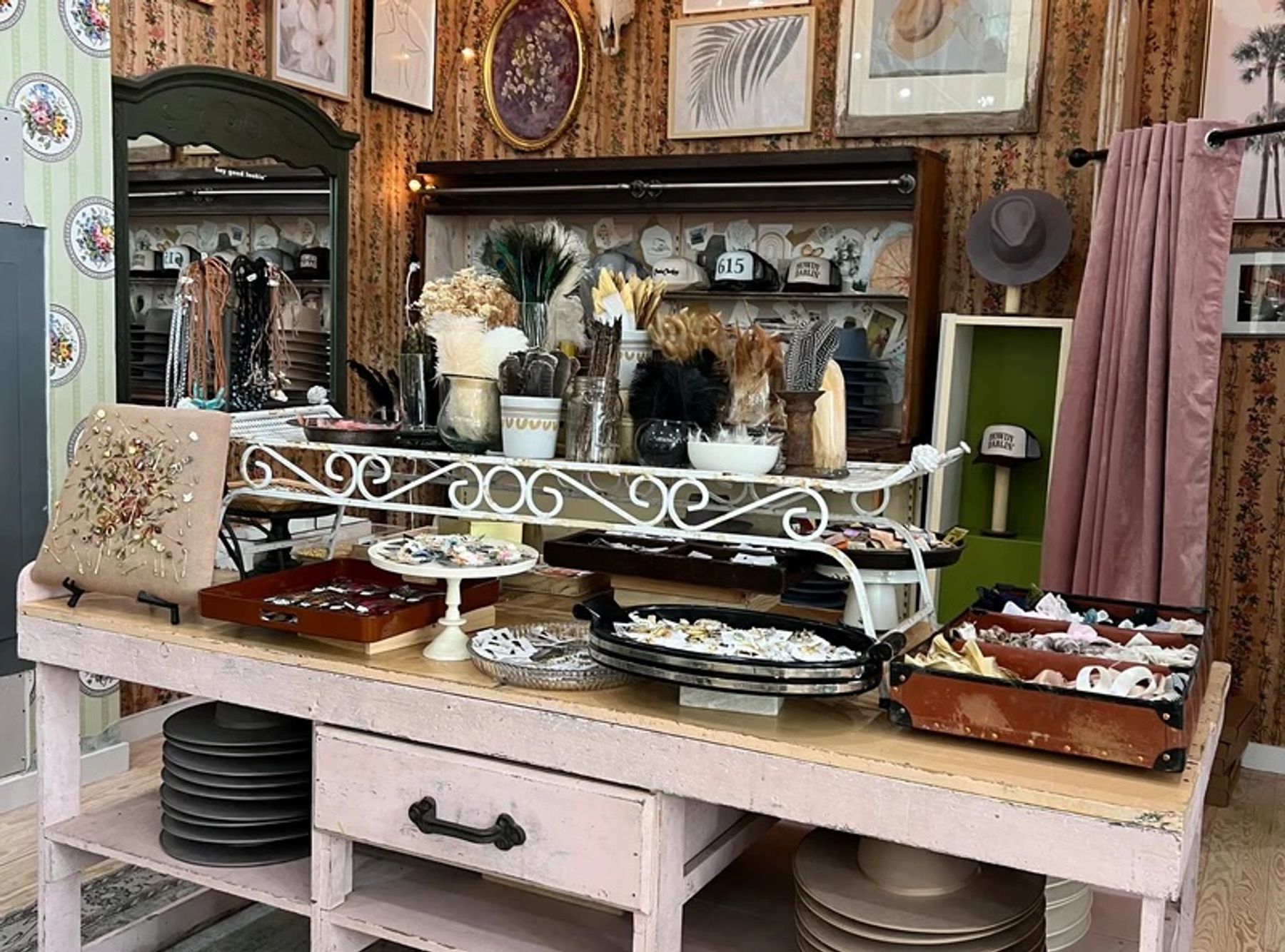 Flea Style offers their Original Hat Bar experience and a robust patch bar for customzing trucker hats. Surrounded by a vintage wallpaper mural and thoughtfully curated art, every corner of the store invites creativity. Whether you're browsing or building your dream hat, it's an experience you won't forget.