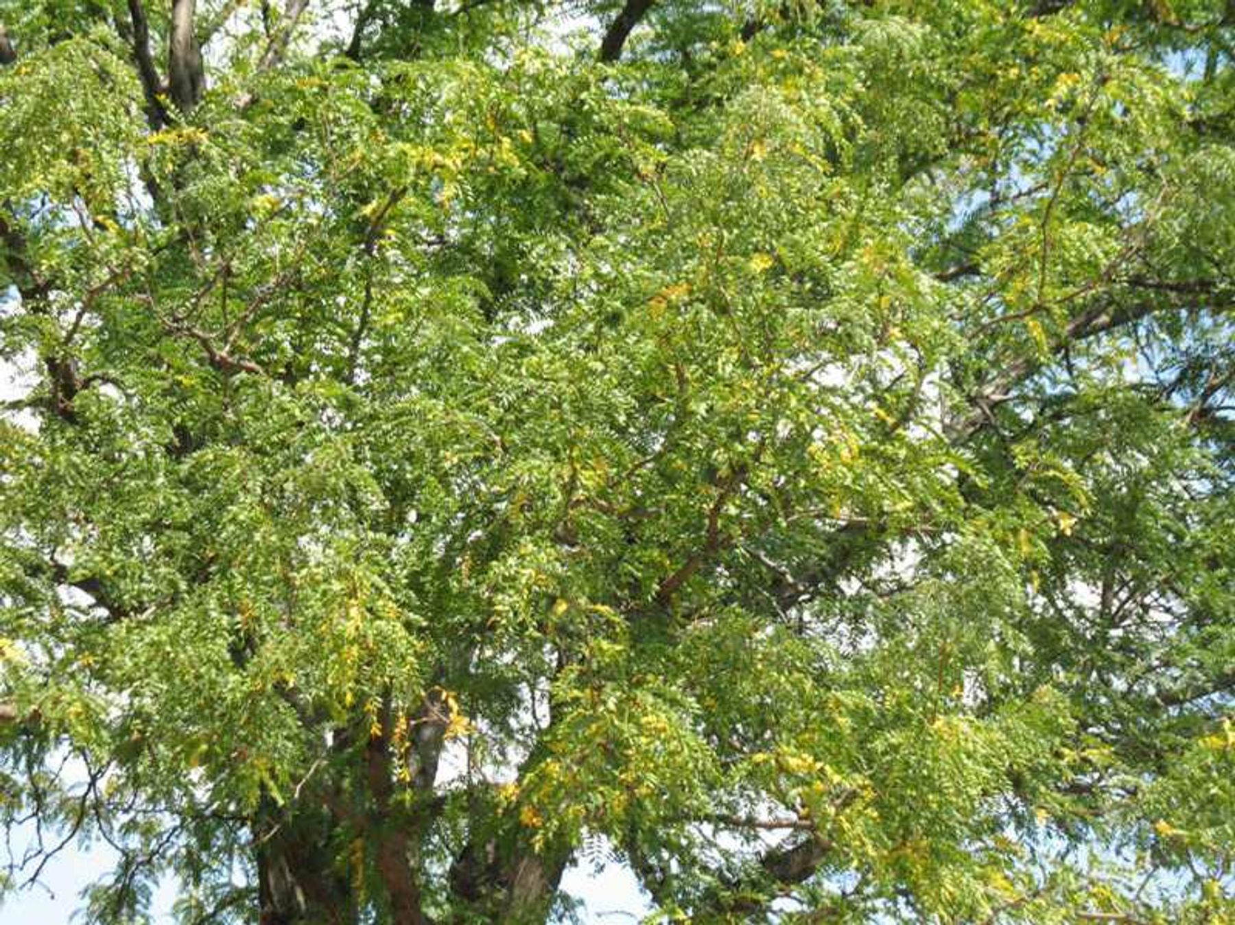 Forma inermis is a thornless variety that occurs naturally in the wild. It grows to the same height as the thorny species plants. Cultivars of G. triacanthos which are sold in commerce today are all cultivars of f. inermis (no thorns and in many cases no seedpods make them preferred landscape plants). Pinnate to bipinnate dark green leaves with ovate leaflets (1/2” to 1 1/2” long) cast a sun-dappled shade. Leaves turn an attractive yellow in fall.