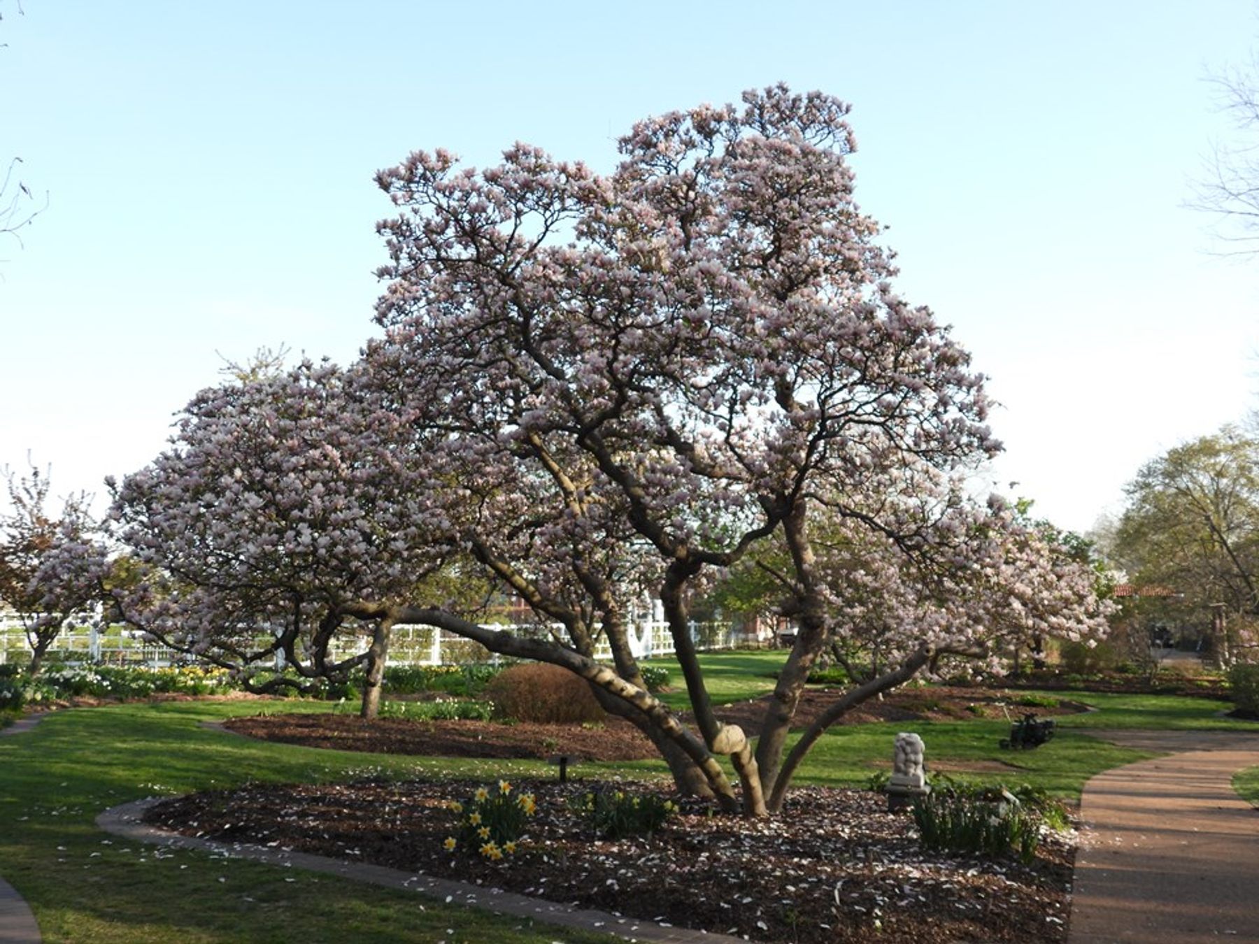 Magnolia × soulangeana, commonly known as saucer magnolia, is a deciduous hybrid magnolia (M. denudata × M. liliiflora). It is the most commonly grown deciduous magnolia. It is a broad shrub or small tree that typically rises to 20-25’ tall with a rounded crown. It is often grown in a multi-trunked shrubby form. It typically matures over time to 20-30’ tall and as wide. Fragrant flowers (to 8” across) bloom in early spring (late March to mid-April in St. Louis) before the foliage emerges. Flowers are pink with white interiors. Sparse numbers of additional flowers may bloom sporadically later in spring on new growth, but the later flowers are usually less vigorous and less colorful than those of the primary bloom. Saucer magnolia is perhaps the most popular deciduous magnolia in cultivation today, with a large number of hybrid cultivars now available in commerce featuring flowers in various shades of white, pink, rose, purple, magenta and burgundy.