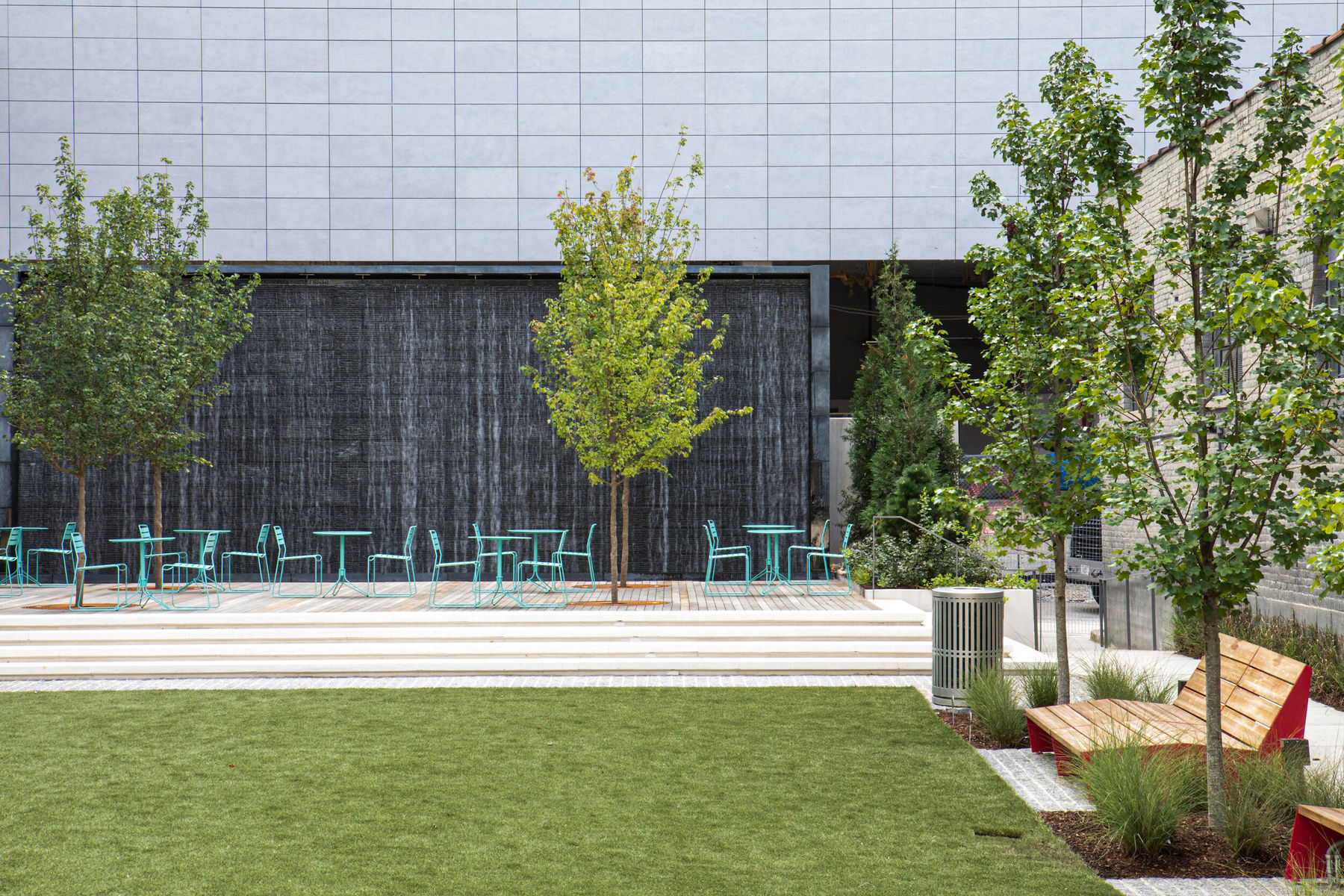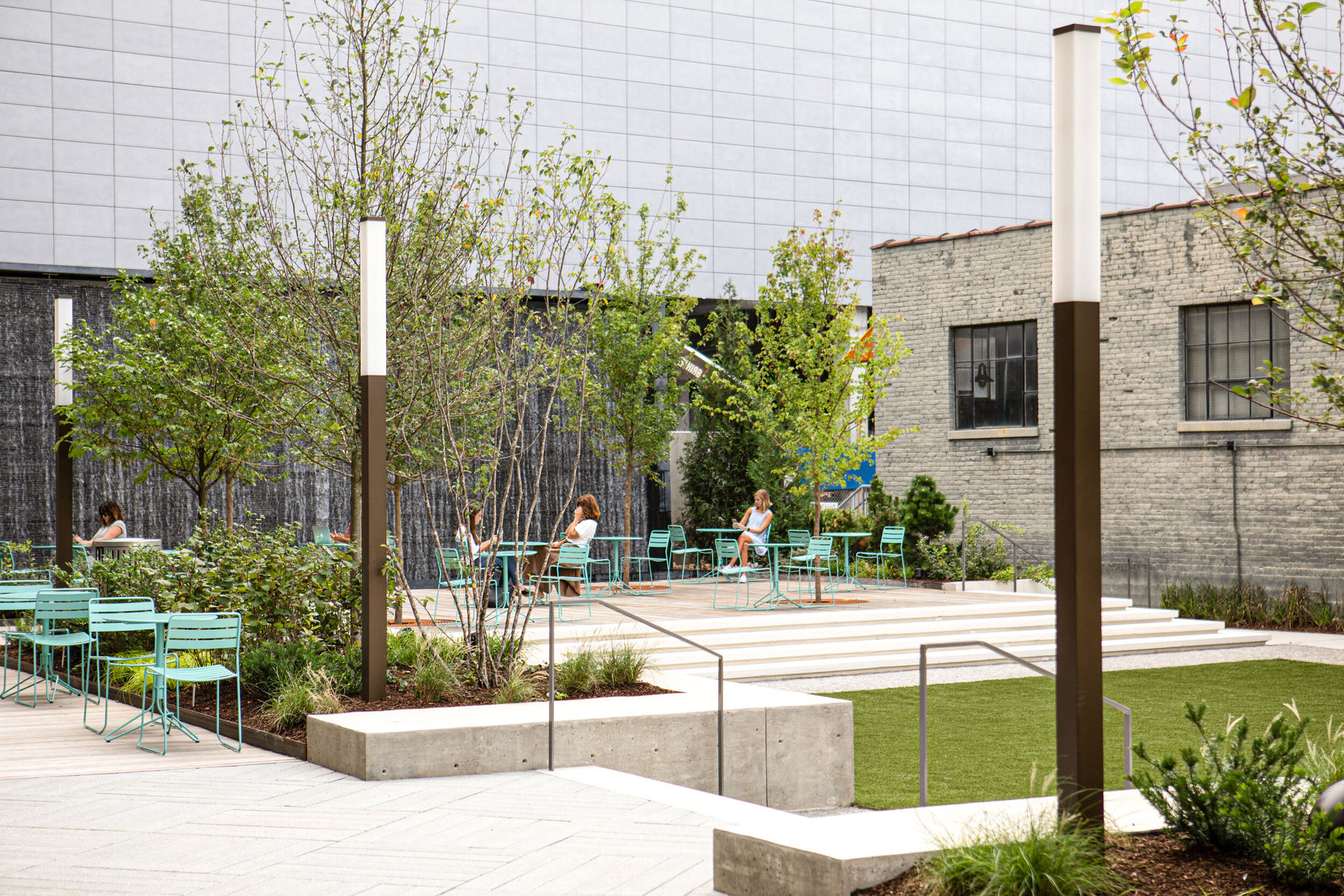 Noble Park, a 10,000-square-foot green space in the Gulch, features water walls, a central lawn, and an elevated boardwalk, hosting regular events to foster community and connectivity.