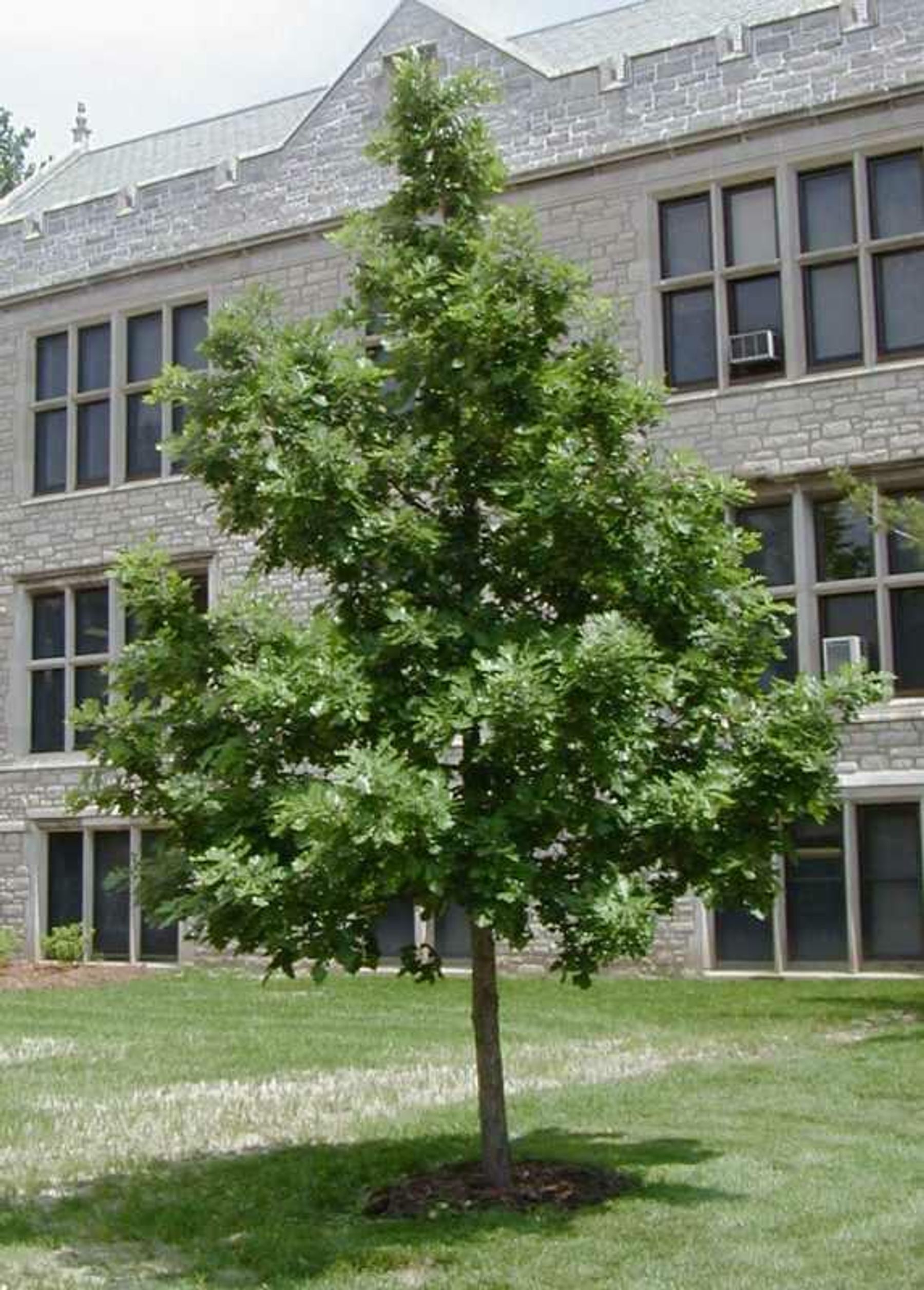 Quercus macrocarpa, commonly called bur oak or mossycup oak, is one of the most majestic of the native North American oaks. It is a medium to large sized deciduous oak of the white oak group that typically grows 60-80’ (less frequently to 150’) tall with a broad-spreading, rounded crown. Acorn cups are covered with a mossy scale or bur near the rim, hence the common names. It is native to a variety of habitats in central and eastern North America. Best growth occurs in bottomland soils, particularly in the Ohio River valley. In Missouri, it typically occurs in low woods and stream valleys in the Ozark region, but on dry upland soils in the unglaciated parts of the state north of the Missouri River (Steyermark). Insignificant monoecious yellowish-green flowers in separate male and female catkins appear in spring as the leaves emerge. Fruits are oval acorns (to 1 1/2” long), with fringed, burry cups that extend to approximately 1/2 to 3/4 the acorn length. Acorns are an important source of food for wildlife. Leathery, dark green leaves (6-12” long) with 5-9 rounded lobes are variable in shape, but usually have a pair of deep central sinuses that extend nearly to the midrib giving the leaf a waisted appearance. Fall color is an undistinguished yellow-brown. Twigs sometimes are ridged with corky wings.