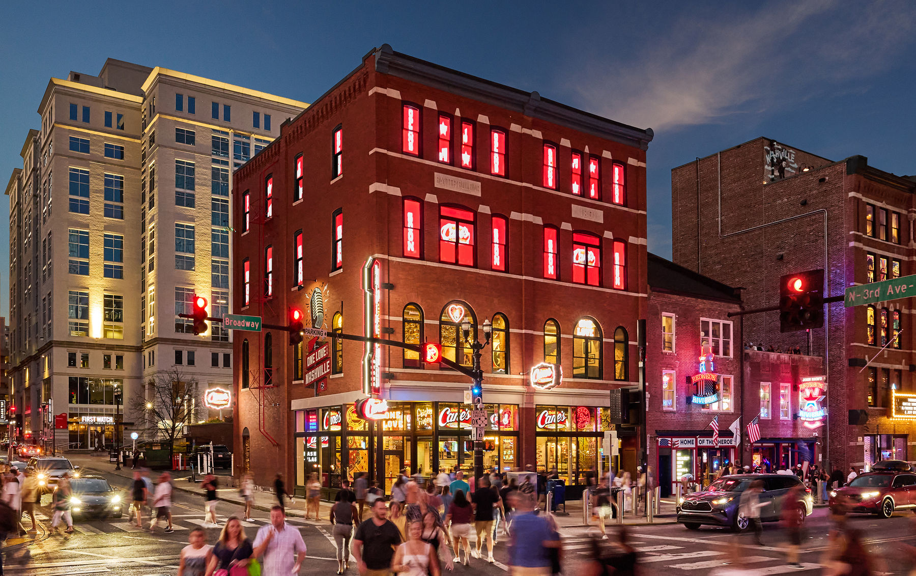 Located on the corner of Broadway and Third Ave. N. at 212 Broadway in the historic Baxter Building, the custom-themed Flagship Restaurant pays homage to country music legends with signature city-inspired flair from local artists and designers such as Hatch Show Print Shop, Ranger Stitch, James Willis, and more. In celebration of the city’s rich history, the Restaurant boasts a feature wall with a colorful horse- riding cowboy made with an impressive 1.2 million rhinestones; a Johnny and June Cash tribute booth for the perfect Nashville photo-moment; a Loretta Lynn signed sequin top and one of her prized guitars; and exclusive Nashville Cane’s merch.