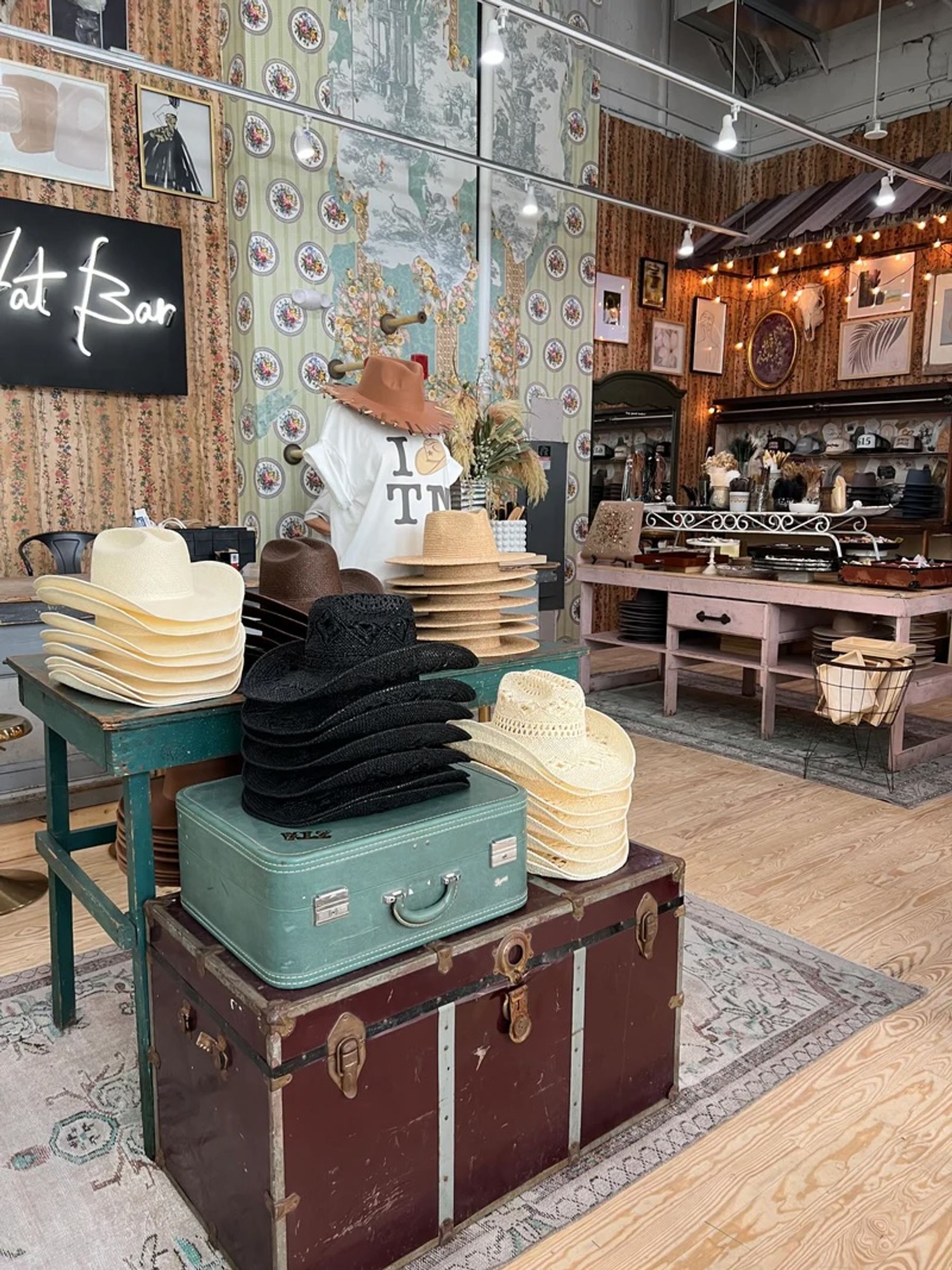 Flea Style offers their Original Hat Bar experience and a robust patch bar for customzing trucker hats. Surrounded by a vintage wallpaper mural and thoughtfully curated art, every corner of the store invites creativity. Whether you're browsing or building your dream hat, it's an experience you won't forget.
