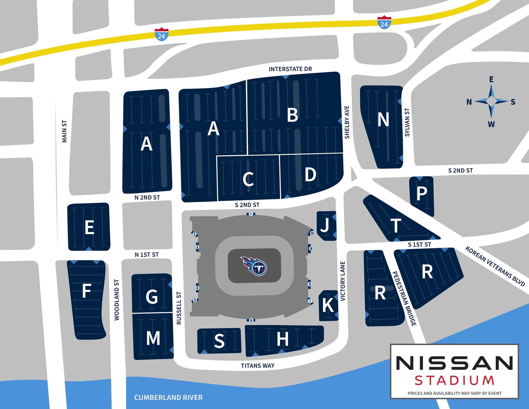- Receive complimentary parking at Nissan Stadium Lot R (see map below) with optional two-way shuttle service (5-7 mins) to Bridgestone Arena (or 10-12 mins walking via the John Seigenthaler Pedestrian Bridge)