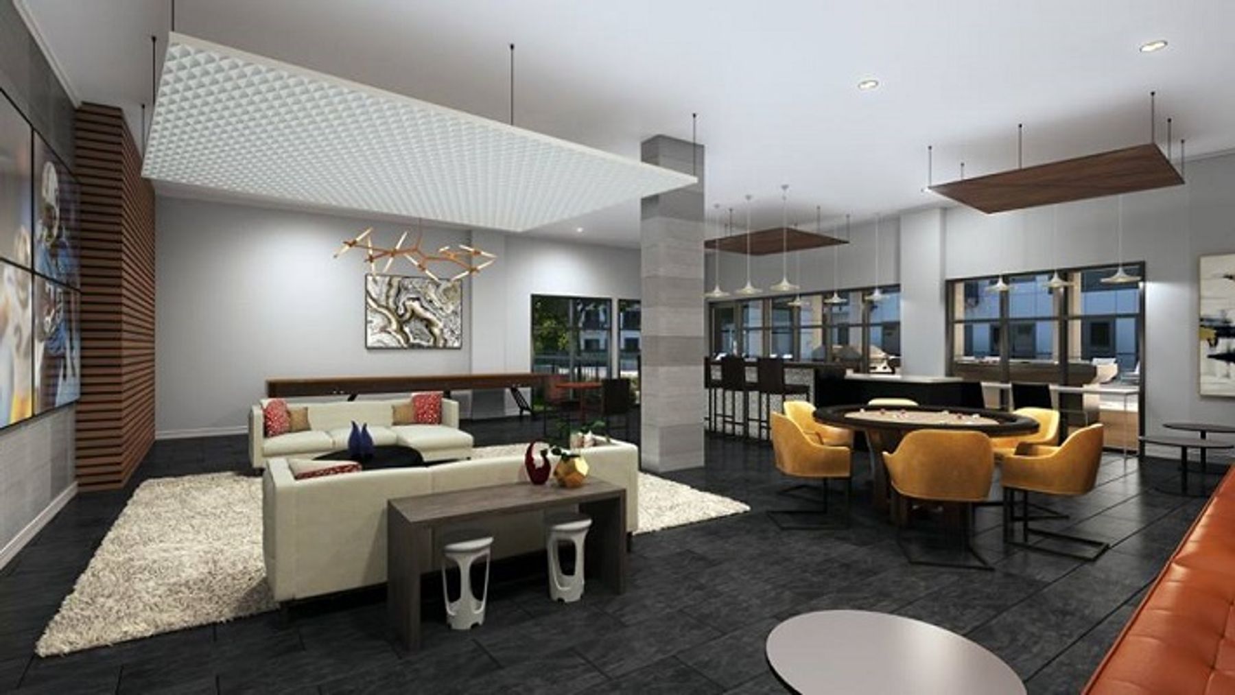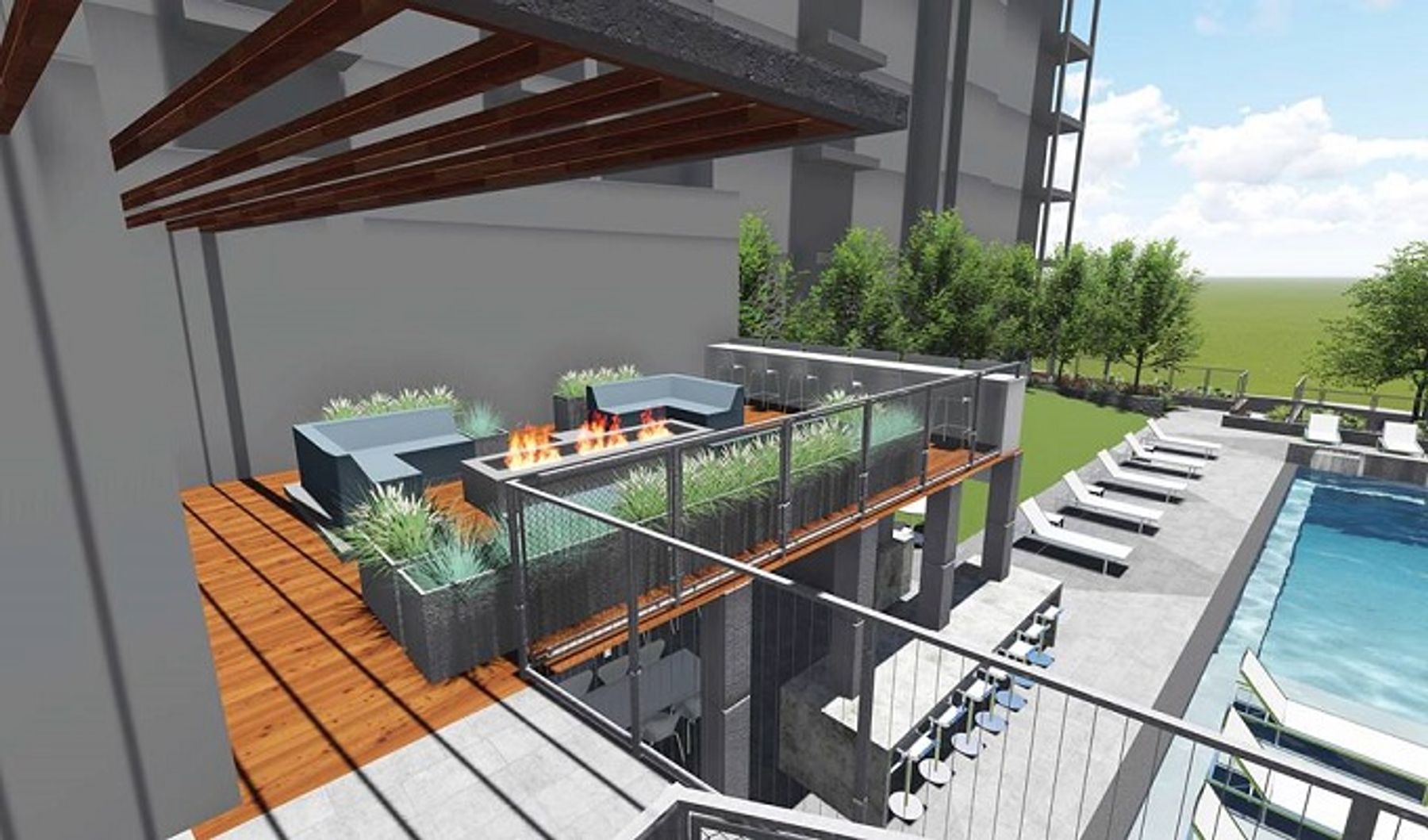 Community amenities include a sparkling pool with sundeck, outdoor grilling and firepit areas, expansive outdoor courtyard, community clubroom and game room, pet wash station and walk area, and a state of the art fitness center featuring Wellbeats personal training system. Enjoy luxury living and sweeping views of downtown and the river from your new home at River House!