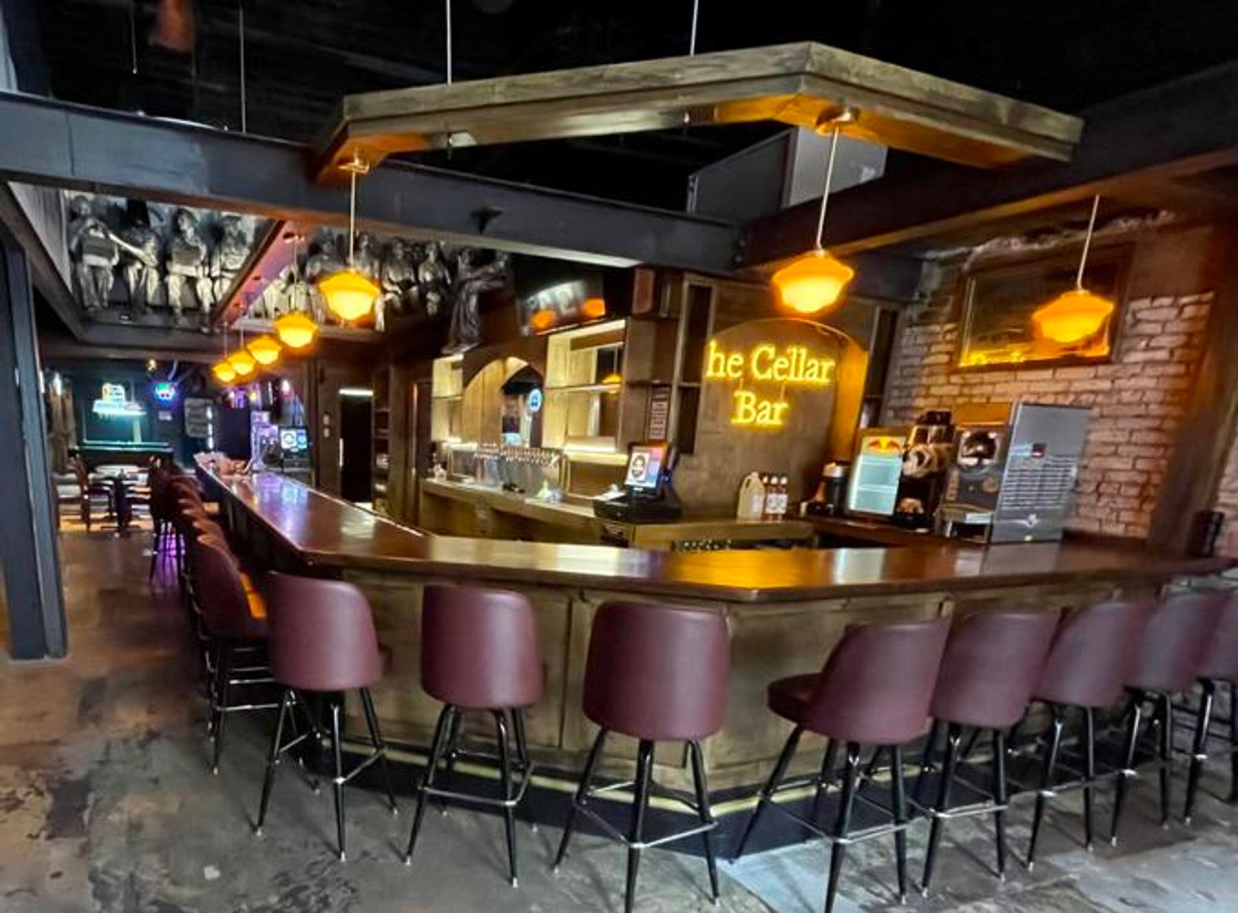 The Cellar Bar offers a jukebox (no live music), 20 beer taps, spirits, basic bar food, two pool tables and two dart boards.